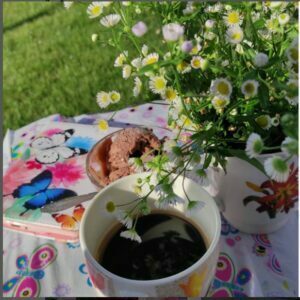 În timp ce fac rugăciuni ca cea mică să mai doarmă, îmi fac o cafea turnând apă clocotită peste cafeaua din ibric. Torn apa miscând-o în sus și în jos pentru a face spumă cât mai multă. Pun pe o tavă cartea, agenda cu notițe și scot înghetata din congelator. Nu îmi place când e bocnă, așa că o las cateva minute pe blatul din bucătărie.  Schimb apa la florile nelipsite din vază. Și abia atunci, trag aer in piept și ies afară să îmi duc întâi cartea, florile și agenda cu notițe. Le asez stangace pe iarbă, apoi intru să pun trei cupe de înghețată, să torn o cană mare cu cafea. Le așez atent pe măsuța ruginită din iarbă. Momentul meu magic de dimineață începe acum în colțișorul meu de dimineață încă neamenajat și durează preț de o înghețată și 30 pagini de carte.