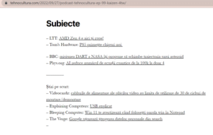 Mersi fain de articol. Îmi dau seama ca a fost greu să asculți podcastul, mai ales că stai cu urechile ocupate tot timpul. Podcastul nu este pentru toată lumea, dar din fericire poate fi oprit și repornit după plac. De altfel, podcasturile de orice fel pot fi ascultate liniștit la 1,5x viteză normală. Fac asta mai tot timpul de ceva săptămâni încoace. Legat de titluri în română, o să fiu ceva mai atent ca titlurile viitoare să fie ceva mai explicite. Mă bucură că podcastul Tehnocultura a fost în grupa acelor mici bucurii zilnice. 😀