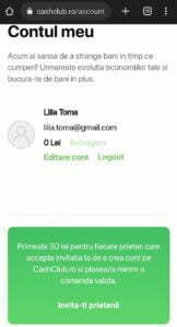 Puteam să o instalez și fără invitație, dar aflasem de programul lor Referral care spunea că dacă primesc o invitație de la un prieten, instalez și comand prin platforma CashClub, primesc și procentul anunțat înapoi, dar și 30 lei. Iar prietenul care m-a invitat primește și el 30 lei. Cum ziceam, în vremurile astea, orice leu necheltuit..
