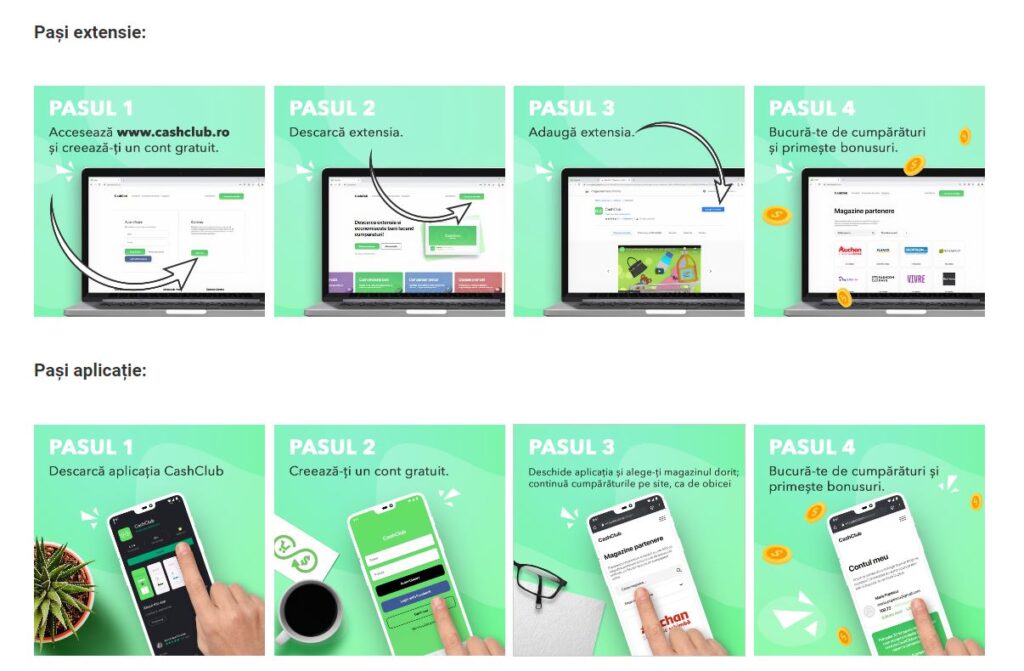- Se poate folosi atât aplicația de pe telefon cât și extensia web din Chrome ro https://cashclub.ro