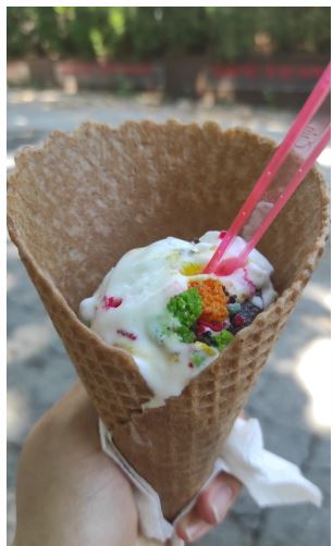M-am răzgândit. Fructe de pădure în loc de căpşuni. Cornet crocant și dulce în care abia încap bulgării reci umpluți cu bucăți de fructe.